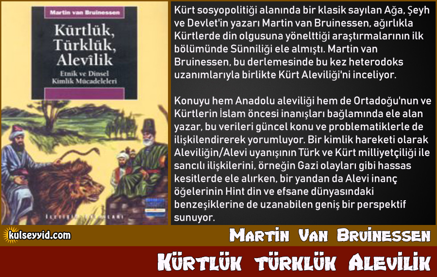 Kürt sosyopolitiği alanında bir klasik sayılan Ağa, Şeyh ve Devlet’in yazarı Martin van Bruinessen, ağırlıkla Kürtlerde din olgusuna yönelttiği araştırmalarının ilk bölümünde Sünniliği ele almıştı. Martin van Bruinessen, bu derlemesinde bu kez heterodoks uzanımlarıyla birlikte Kürt Aleviliği’ni inceliyor. Konuyu hem Anadolu aleviliği hem de Ortadoğu’nun ve Kürtlerin İslam öncesi inanışları bağlamında ele alan yazar, bu verileri güncel konu ve problematiklerle de ilişkilendirerek yorumluyor. Bir kimlik hareketi olarak Aleviliğin/Alevi uyanışının Türk ve Kürt milliyetçiliği ile sancılı ilişkilerini, örneğin Gazi olayları gibi hassas kesitlerde ele alırken, bir yandan da Alevi inanç öğelerinin Hint din ve efsane dünyasındaki benzeşiklerine de uzanabilen geniş bir perspektif sunuyor.
