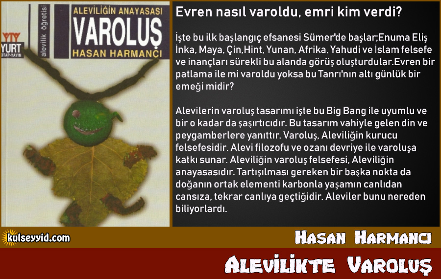 Hasan Harmancı ‘Aleviliğin Anayasası: Varoluş’ta, dünyanın kuruluşu, insanın yaratılışı ve varoluşu konularına Alevilik öğretisinin getirdiği yorumu anlatıyor. Alevi ozanların bu temayla kurdukları şiirler düşünüldüğünde, öğretinin bu anlamda önemli bir birikime sahip olduğu kuşkusuz. Alevilik felsefesi, Tanrı-doğa-insan ilişkisini, Tanrı’dan çıkıp yeniden Tanrı’ya dönen bir çevrim üzerinde açıklar. Harmancı, konuya dair elde bulunan kaynaklar ve kutsal kitaplarda yer verilen kuramlar ve meselleri anlattıktan sonra; Alevilik kuramı ve Aleviliğin mitolojik verilerinin dünyanın kuruluşu, insanın yaratılışı ve varoluşu konusunu nasıl açıkladığını inceliyor.