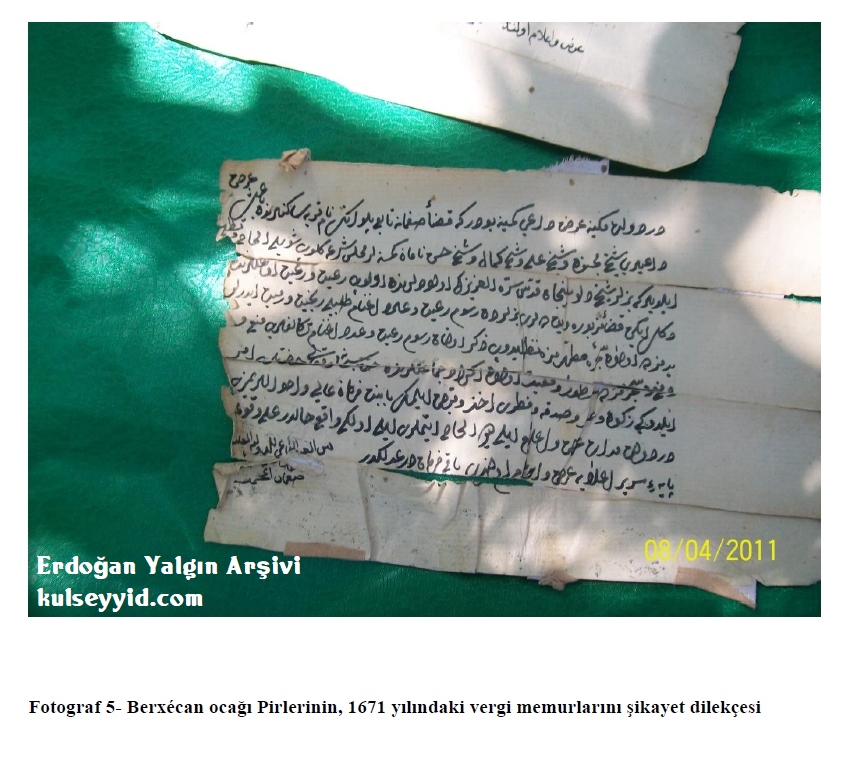 “Der devlet-i mekine arz budur ki kaza-i Sağman‟a tabi tabi Pilvenk nam karye sakinlerinde bâis-i arz dâileri Şeyh Mecnun Şeyh Ali Şeyh Kemal Şeyh Hasan nâmân kimseneler meclis-i şer‟a gelüb şöyle elhâc ve tazallum eylediler ki bizler şeyh Dilu Belincân kaddese sırrahul azizin oğullarından olub raiyyet ve raiyyeti oğullarından değilken kaza-i mezbure voyvodaları bizlerden rusûm-u raiyyet ve adâd-i ağnam talebiyle rencide ve remide ederler. Yedimizde olan şecere-i mutahharamıza nazar idüp zikr olunan rusûm-u raiyyet ve adad-i ağnam tekalüflerini men‟ ve def‟ birle şeceremizde manzur ve muteber olan diğer zikr iden cemaatlerden hakk-ı sebtine edasına evamirini hazretlerine emir eyledüğü zikr ve emir ve sıdaka fıtr ahz kabz eylemeyin babında fermân-ı âli ve ahvâllerimizin der devlet-i merama arz eyle deyü ilhâc itmeleri ile ola ki vaki‟ haldir ala vukû-u paye-i serir-i âlaya arz iderim. Aherin bâki fermân der aliyyemindir.“ ( Bkz. Fotoğraf 5- Berxécan ocağı Pirlerinin 1671 yılındaki şikayet mektubu)