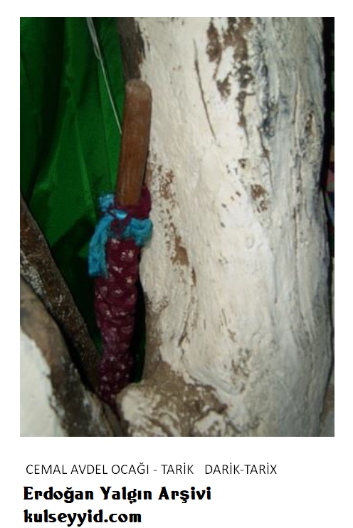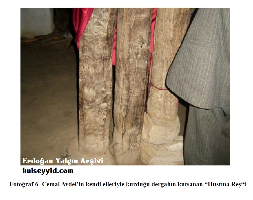 Kapıdan içeriye girildiğinde, sol taraftaki duvarda ateşin yandığı bir ocak (Rojın)32 bulunmaktadır. Bu mekanın içindeki tavan cısırları oldukça eskimiş bir vaziyette olup, halen canlılığını korumaktadır. Mekanın içinde tavan çısırlarının altına atılmış sütun/direkler Ustuna Reş/Hustına Reş/Kara direk bulunmaktadır. Aynı kutsi gelenek, Mazgirt‟in Kızılkale (Dirban) köyünde Şadiyan aşiretinden olan Laçoların damevine/dergahına ve Muxundi‟deki “Turabi ocağı/ziyaretine” taşınmıştır (Köksal, 2001: 18). Böylece Şadiyan talipleri arasında kutsanan Hustına Reş, Cemal Avdel nezdinde, Berxécan‟a uzanan bu uzun ince yolda, kutsal bir su gibi ana yatağına yürümektedirler. Kutsanan Hustına Reş‟le birlikte, Cemal Avdel dergahında bir de “tarıx/darik” dedikleri, dinsel ritüellerde kullanılan ve başka bir tanımla ona, “ziyaret/bumbarek” dedikleri kutsal “asa” bulunmaktadır. Bu kutsal asaya, Kürt Ré Heq inancında “daré heq/daré heqi, daré Xızıri, Cuyé heq, Cuyé Xızıri” diyerek, üzerine yemin ederler. Tarıx/darik, Berxécan ocağında da kutsanmaktaydı. (Bkz: Fotoğraf 6- Cemal Avdel‟in kendi elleriyle kurduğu dergahın kutsanan “Hustına Reş“i)