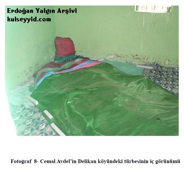 Söylentiler muhtelif. Derler ki; Cemal Avdel, “don-be-don/kalıp degişimi” don degiştirmden, hakka yürümeden önce, bu köydeki taliplerine vasiyet eder. Hakka yürüdügü zaman köyün en hakim tepelerinden olan, şu anki ıstırhatgahının yerini nişanlayarak taliplerinden kendisini, burada toprağa verilmelerini ister. Vaktaki pirler-i sanileri, hak ile hak olmuş; köylüler/talipleri bu vasiyete uyup, ahte vefa etmişler. Cemal Avdel sırra kadem bastığında, Delikan köy mezarlığında herd-u medfun etmişler. Dört metre uzunluğunda ve dört metre genişliğinde, duvarlarının dış çevresinin yeşil boyasıyla hemen dikkatleri çeken bir türbede yatmaktadır. Bu mezarlık, Delikan köyünün üstünde yer almaktadır. Mezarlığın altında ve yine köyün üstündeki düzlükte bulunan (axpin) tarla, 1960 larda kadastıro kayıtlarında Cemal Avdel‟in üzerine vakf edilmiştir. Pir Cemal Dedeoğlu’nun (1953) bize verdiği bilgiye göre, bu axpin/tarla, tapu siçilinde “Cemal Avdel‟in üzerine kayıtlı olduğu” yazmaktadır. (Bkz. Fotoğraf 7- Cemal Avdel‟in Türbesinin iç görünümü)