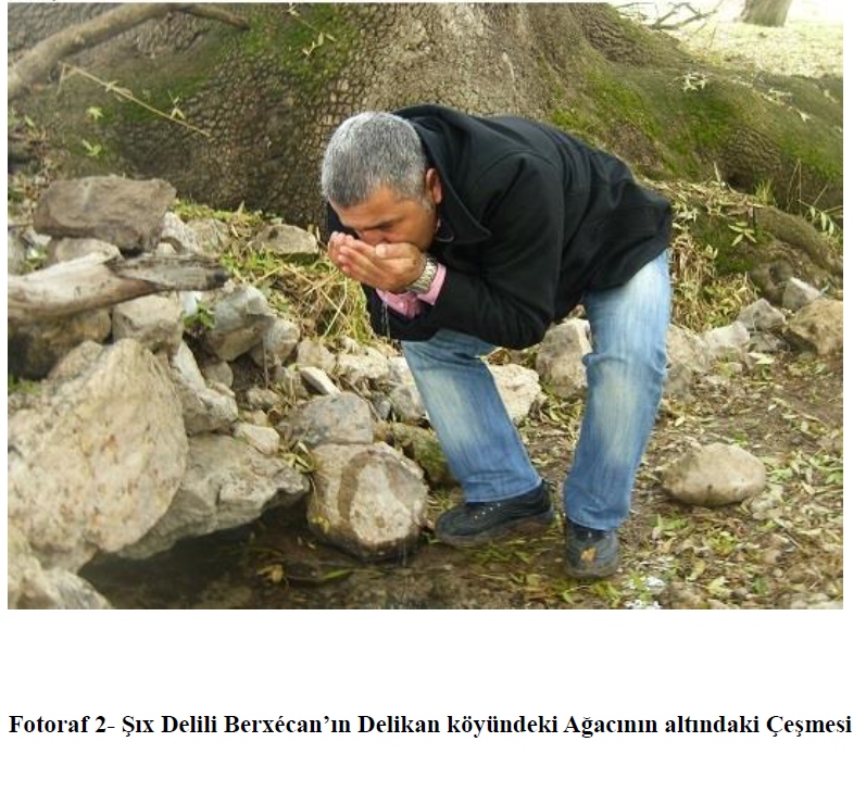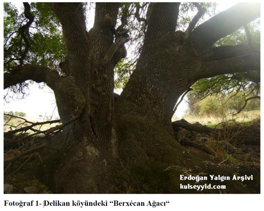 Bütün bunlarla birlikte, Kurmanci telafuzunda “Delkan” olarak da anılan köyün, Cemal Avdel ismiyle özdeşleştiği bilinmektedir. Köy halkının ana dili Kurmancidir. Kurmanci dilini akıcı ve ağdalı bir formda konuşan köylülerin ortak hafızası, oldukca berrak ve güçlüdür. Köylülerin kendi yol atalarına ilişkin anlatımları, süreklilik arzeden bir biçimde Berxécan üzerinde yürütülmektedir. Bütün anlatımlarda; Delikan köyü, Cemal Avdel ve Berxécan, birlikte mitik metaforlarla takdis edilmektedirler. Bu konuda umumi görüş odur ki; Berxécan‟ın Delikan köyünü ziyaret ettiği, oradaki cemaatle “cem-i cıvat” olduğu sözlü gelenekte anlatılmaktadır. Buna kanıt, Delikan köyünde bir “Berxécan Çeşmesi=Kaniya Berxécan4 ve bu çeşmenin başında bir koca “Benaw/Dişbudak ağacı=Dar a Berxécan” bulunmaktadır. (Bkz. Fotoğraf 1- Delikan köyündeki Berxécan Ağacı. Fotoğraf 2, Berxécan ağacının altında akan çeşmesi)