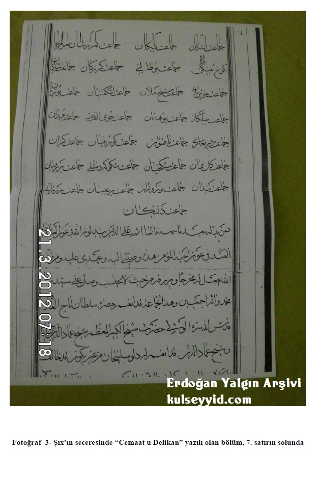 5) Arapca bir sözcük olan Cemaat, yanyana gelmiş, aynı yaşam alanını paylaşan, küçük topluluklardır. Bir yere toplanmış insanların çoğuluna “Cemaat” denir. Örneğin, klasik Arapça yazmalarında, bir köyün mensuplarına “cemaat” denirdi. Bu cemaatler, liderlerinin yada köylerinin/bölgelerinin adlarıyla anılırlar. Bu türden cemaatler, genellikle kandaş/klan çekirdek aileleri ifade eder. Tarihsel süreçleri içinde bu kandaş cemaatler büyüyerek, aşiret adını alır. H. 400/1009-10 yılında yazılan Şıx Dilo Belincan‟ın şeceresinde, günümüzün Kürt aşiretlerine “Cemaat” sıfatı kullanılmıştır. “Cemaat” için ayrıca bkz. (Öztürk, 2004: XlV; Özön, 1998: 120); (bkz. Fotoğraf 3- Şıx‟ın şeceresinde “Cemaat u Delikan” yazılı olan bölüm, 7. satırın solunda)